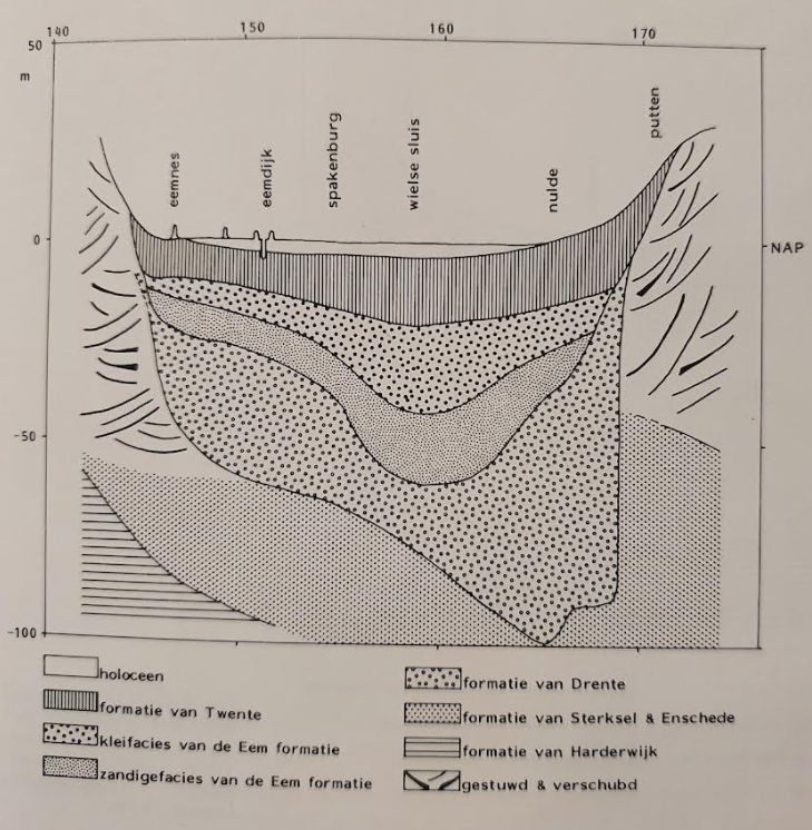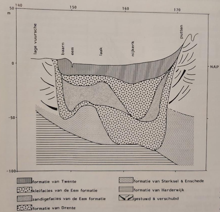 • Bovenop de door de rivieren afgezette zanden bevindt zich weer een laag die door de zee is afgezet. Dit is dan ontstaan doorat in de volgende periode de zeespiegel steeg waardoor de zee weer binnendrong in ons gebied, en weer zand- en kleilagen afzetten. Deze laag, de Eemafzetting genoemd, loopt vanuit het zuiden af, totdat deze bij Nijkerk tussen de 20 en 50m diepte: in het midden van de Vallei op 50m, aan de ronden tot 20m diep. De eemklei belemmert de verticale beweging van grondwater. De watervoerende delen van de formatie van Drente en de Eemformatie vormen samen een watervoerende laag, het zogenaamde middeldiep grondwaterwater voerende pakket.